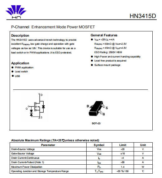 主要參數:-20V -4A SOT-23