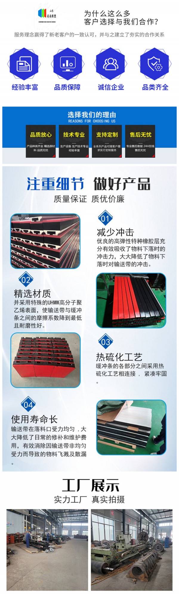 1、緩沖條組合成的弧形表面與輸送帶的面接觸,保證了輸送帶運行的流暢,有效地防止了對輸送帶的損傷;